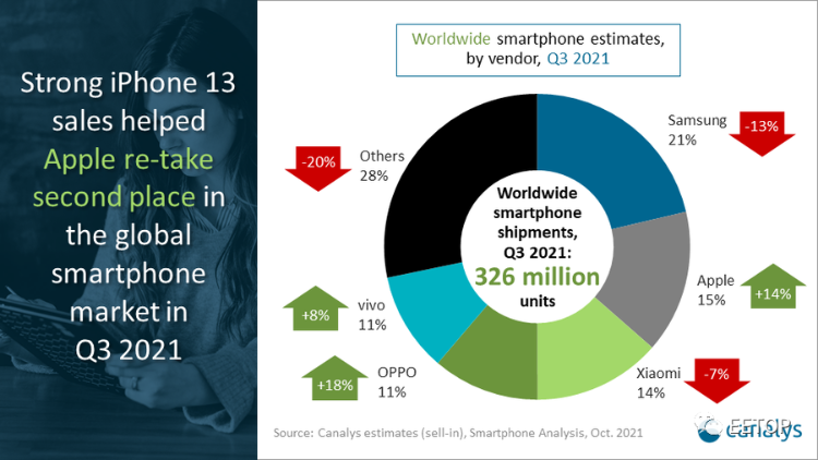 今日市调机构Canalys发布了第三季度全球智能手机以及中国大陆智能手机市场占有率排名数据。