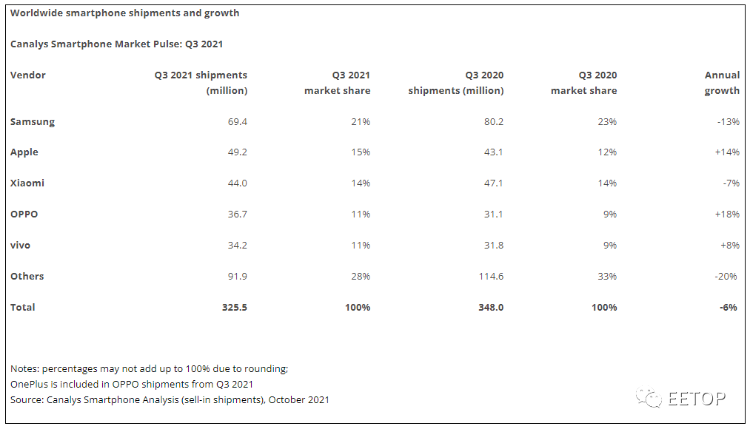 全球市场方面,2021 年第三季度智能手机出货量同比下降 6%。三星再次成为领先供应商,出货量为 6940 万部,占 21% 的份额。随着 iPhone 13 的推出,苹果击败小米,重新回到第二位置,智能手机出货量为 4920 万部,增长 14%。小米以 4400 万台和 14% 的份额位居第三,而 OPPO 和 vivo 位居第四和第五,出货量分别为 3670 万和 3420 万台。