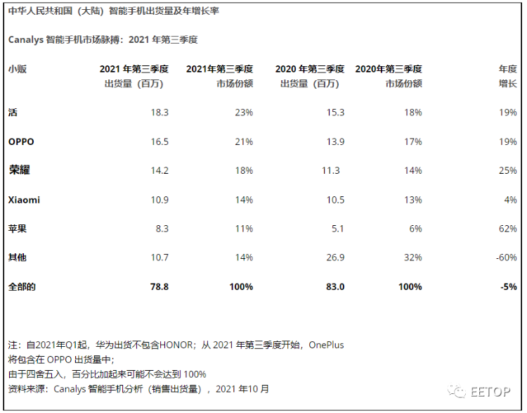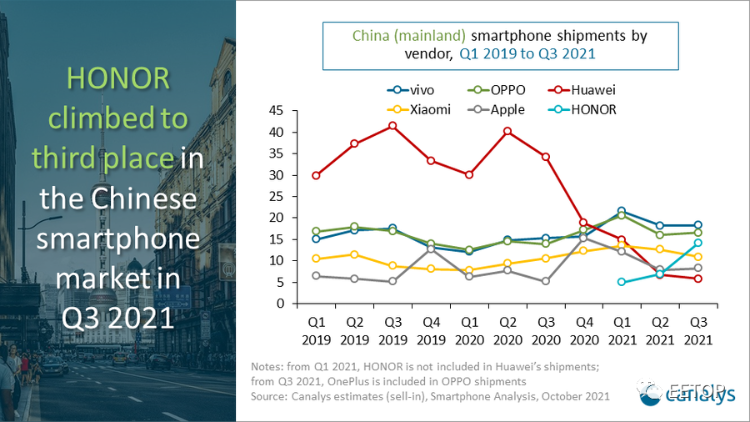 Canalys 表示第三季中国智能手机市场出货量前三名分别为vivo、OPPO(包含一加),以及荣耀,数量分别为1830 万支、1650万支,以及1420 万支。当中让市场惊讶的是荣耀已经重新回到第一集团,市占率从第二季的9% 上升至第三季的18%。