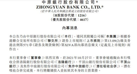 10月27日,中原银行股份有限公司(以下简称“中原银行”)发布公告显示,该行董事会通过决议,拟吸收合并洛阳银行、平顶山银行及焦作中旅银行。在潜在吸收合并完成后,中原银行将继续投入并拓展其本省的主营业务。