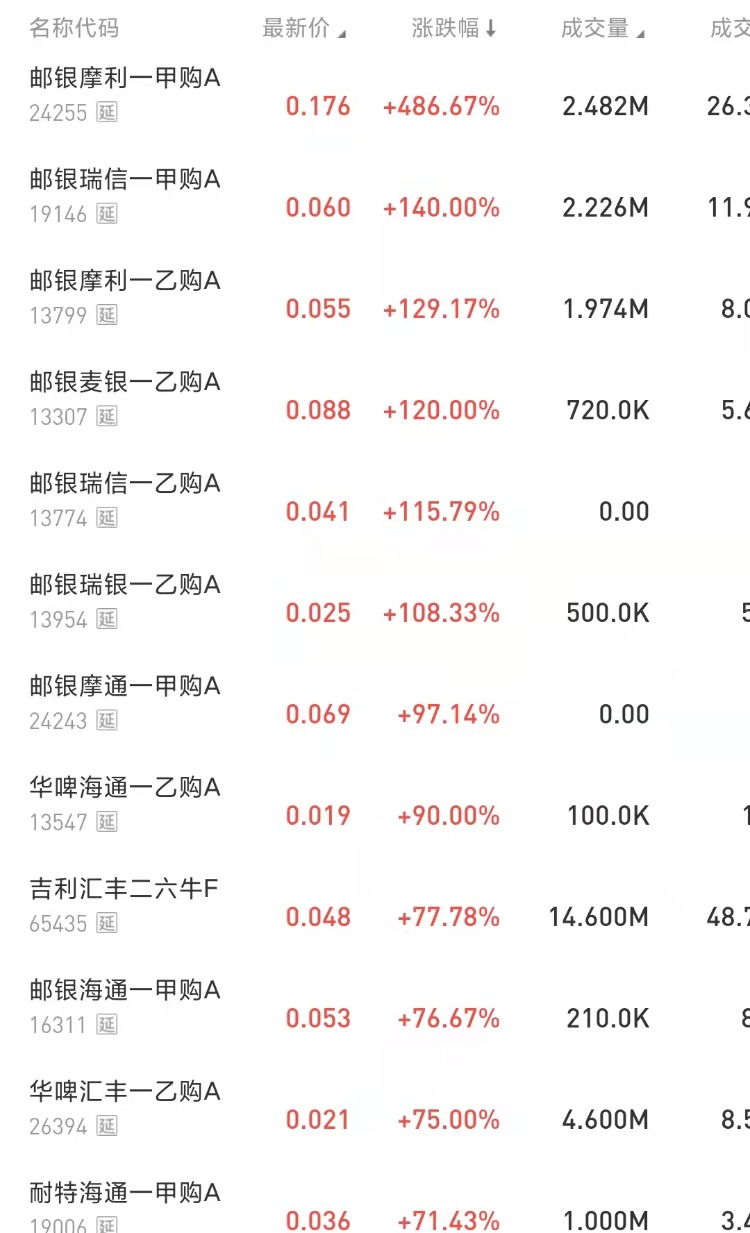 涨幅居前的包括:邮银摩利一甲购A $24255.HK 涨486.67%,华啤海通一乙购A $13547.HK z涨90.00%,吉利汇丰二流牛F $65435.HK 涨77.78%;