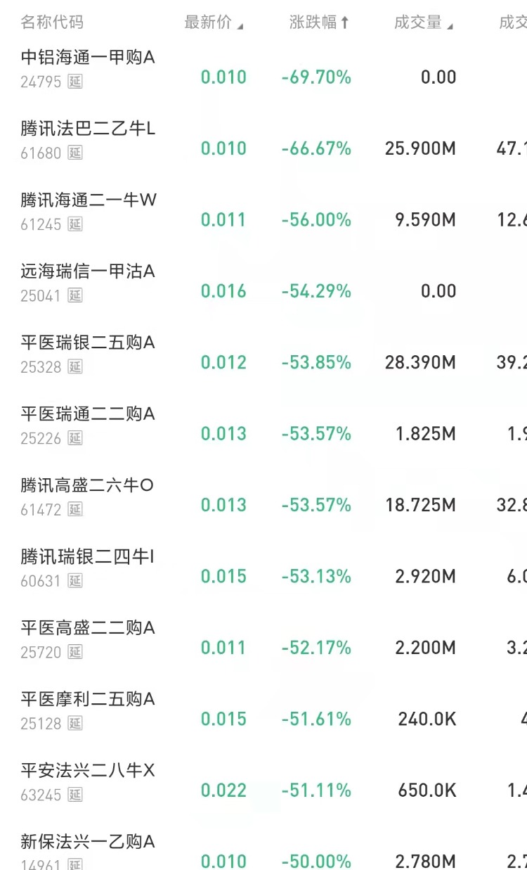 在今日跌幅榜中,腾讯法巴二乙牛L $61680.HK 跌66.67%,平医瑞银二五购A $25328.HK 跌53.85%。