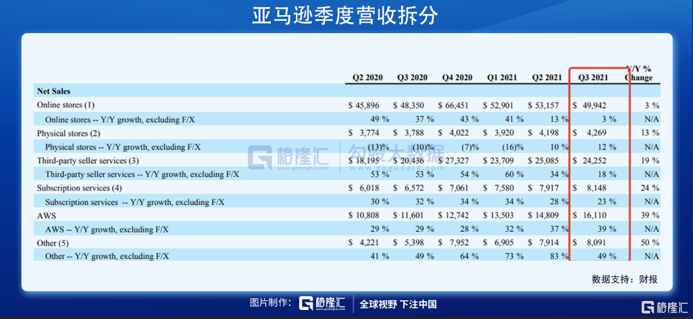 不过以此来判断亚马逊帝国陨落是不靠谱的。首先可以看到第三方卖家服务的增长同比仍有18%,订阅会员收入同比增长23%,商业模式非常稳健。更为重要的是,第二增长引擎云计算AWS继续保持同比高增长,Q3同比增39%。并且这个赛道代表着未来,大行预期可见未来仍会保持两位数的高增长,这个第二增长曲线非常稳。