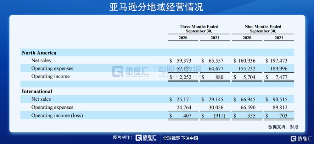 所以整体来看,亚马逊的商业帝国还是很稳的。接下来看看不同地域的情况: