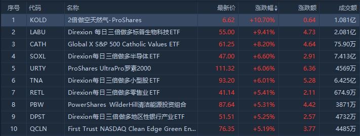 其他ETF方面,2倍做空天然气ETF $KOLD 涨10.70%,成交额1.081亿美元;每日三倍做多小型股ETF $TNA 涨6.01%,成交额6.425亿美元;每日三倍做多零售业ETF $RETL 涨5.41%,成交额674.9万美元。