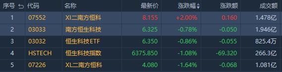 南方两倍做多恒科 $07226.HK 跌1.64%,成交额为1.081亿港元;
