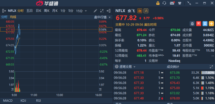 奈飞股价续刷历史新高,总市值突破3000亿美元,现涨约0.56%。