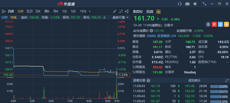华盛资讯10月29日讯,美股盘中,热门中概股普遍下跌。截至发稿,百度(BIDU)、腾讯音乐(TME)跌超4%,京东(JD)、哔哩哔哩(BILI)、拼多多(PDD)跌近3%,阿里巴巴(BABA)、台积电(TSM)跌近2%。