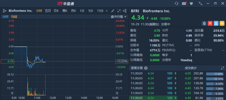 华盛资讯10月29日讯,Biofrontera $BFRI 首挂低开,截至发稿,跌幅收窄至13%,报4.34美元/股。