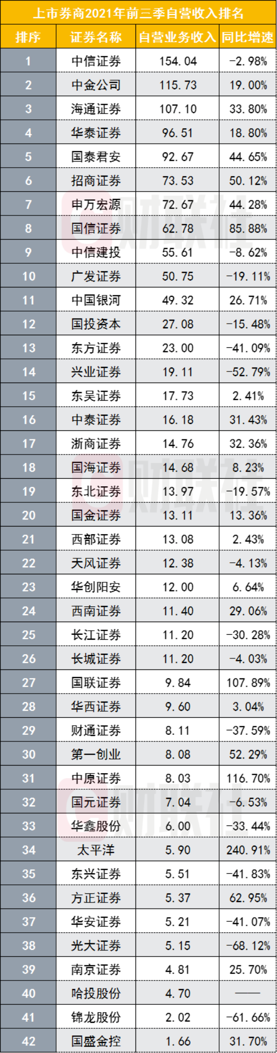 2021年前三季度自营业务收入排名前十的券商分别是中信证券(154.04亿元)、中金公司(115.73亿元)、海通证券(107.10亿元)、华泰证券(96.51亿元)、国泰君安(92.67亿元)、招商证券(73.53亿元)、申万宏源(72.67亿元)、国信证券(62.78亿元)、中信建投(55.61亿元)、广发证券(50.75亿元)。
