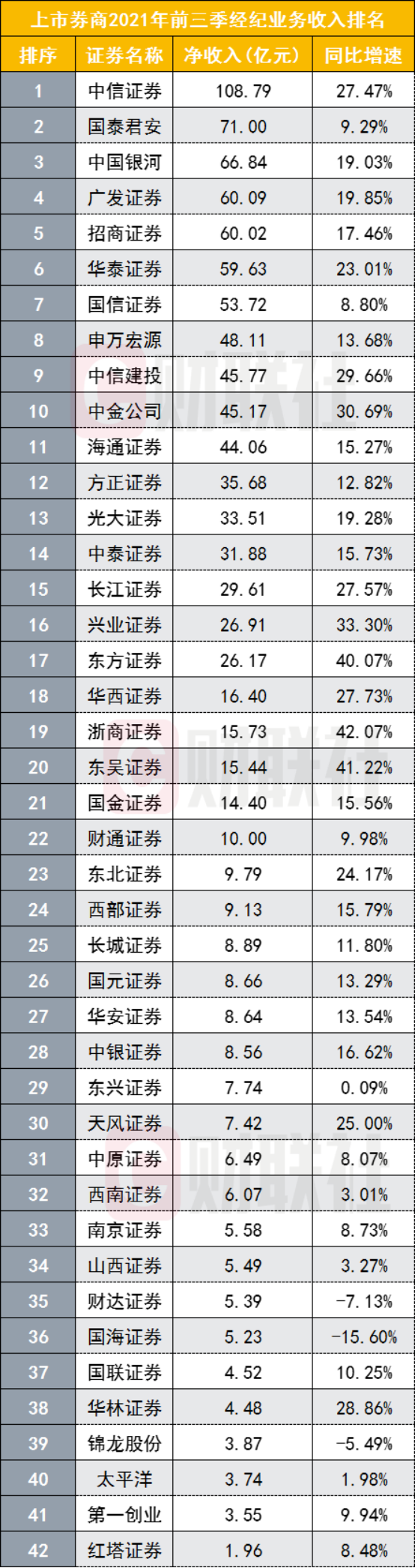 经纪业务收入方面,上市券商2021年前三季经纪业务收入排名前十券商分别是中信证券(108.79亿元)、国泰君安(71.00亿元)、中国银河(66.84亿元)、广发证券(60.09亿元)、招商证券(60.02亿元)、华泰证券(59.63亿元)、国信证券(53.72亿元)、申万宏源(48.11亿元)、中信建投(45.77亿元)、中金公司(45.17亿元)。