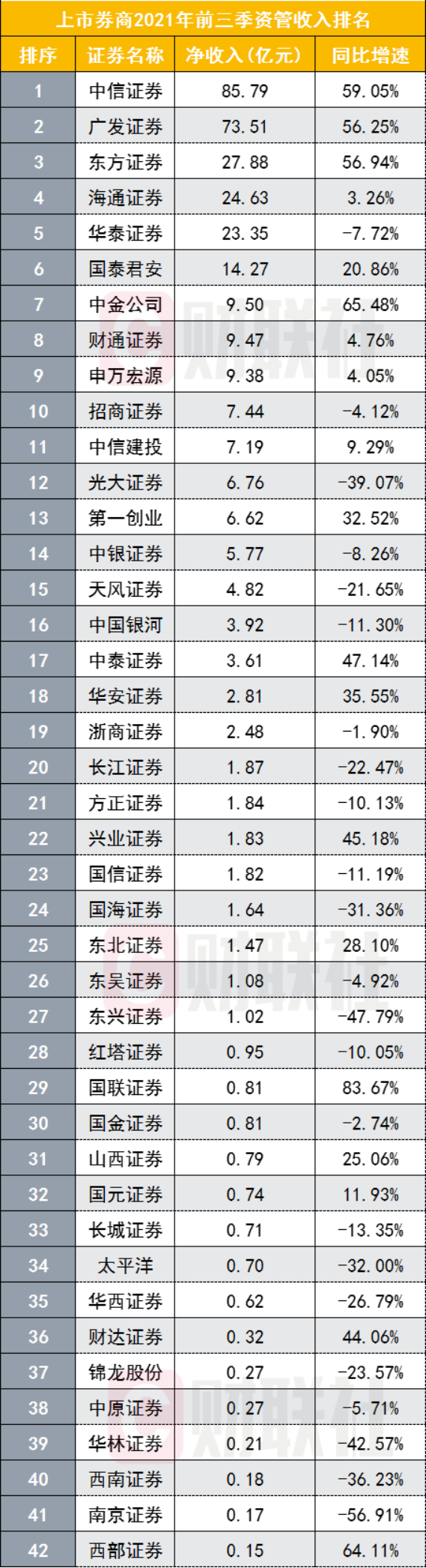 增速方面,中信证券、中信建投、广发证券是排名前十券商中仅有的3家增速下滑券商,同比增速分别为-2.98%、-8.62%、-19.11%。