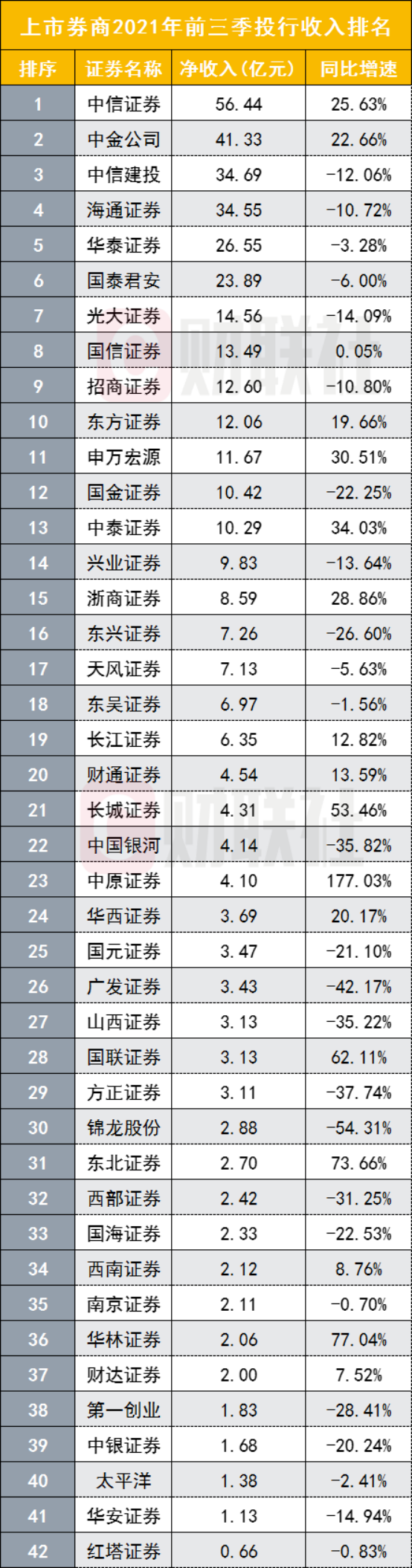 整体来看,17家投行收入增速为正,25家券商投行收入下滑。
