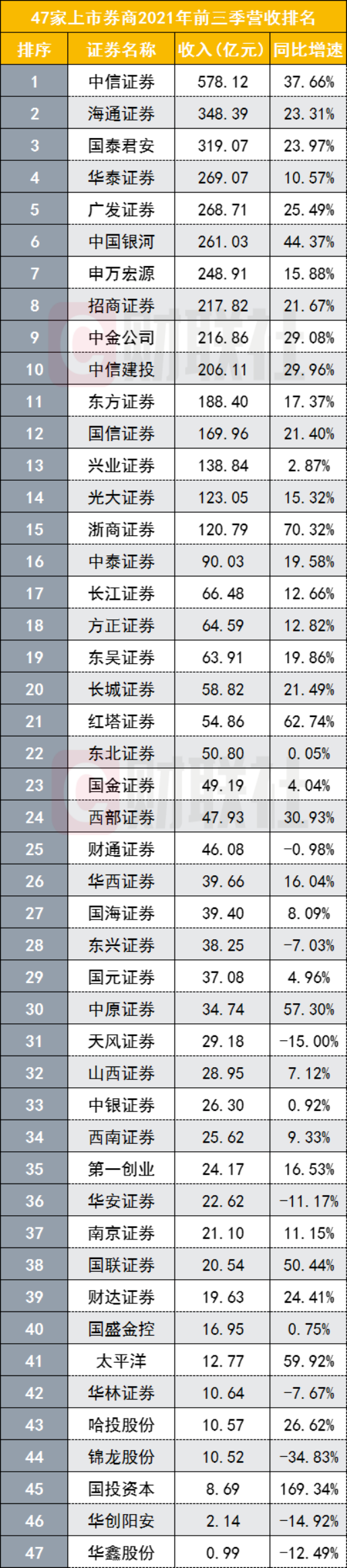 原标题:47家上市券商三季报出齐:4家净利超百亿,上年同期仅1家,中信营收逼近600亿,详看五大业务全排名