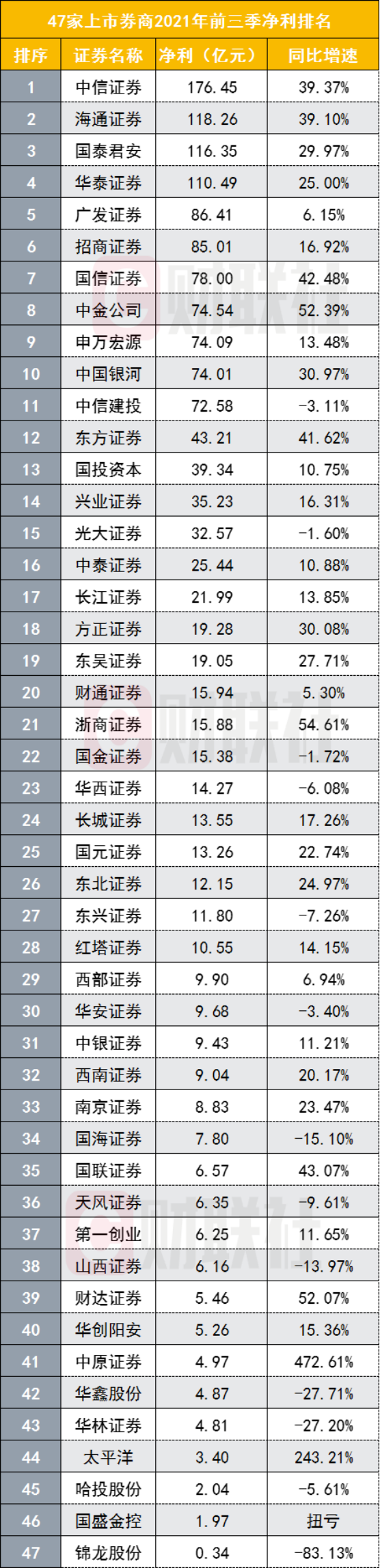 2021年前三季净利润排名前十的券商分别是中信证券(176.45亿元)、海通证券(118.26亿元)、国泰君安(116.35亿元)、华泰证券(110.49亿元)、广发证券(86.41亿元)、招商证券(85.01亿元)、国信证券(78.00亿元)、中金公司(74.54亿元)、申万宏源(74.09亿元)、中国银河(74.01亿元)。