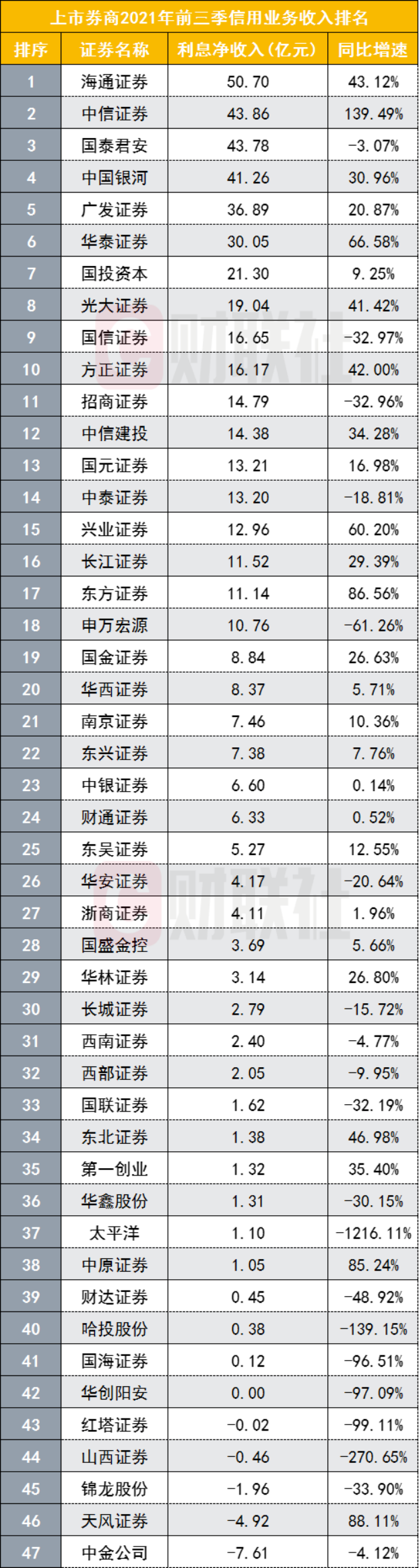 今年前三季信用业务收入前十券商分别是海通证券(50.70亿元)、中信证券(43.86亿元)、国泰君安(43.78亿元)、中国银河(41.26亿元)、广发证券(36.89亿元)、华泰证券(30.05亿元)、国投资本(21.30亿元)、光大证券(19.04亿元)、国信证券(16.65亿元)、方正证券(16.17亿元)。