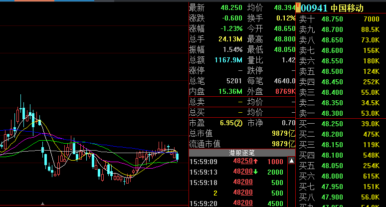 截至29日收盘,港股中国移动跌1.23%,报48.25港元/股。