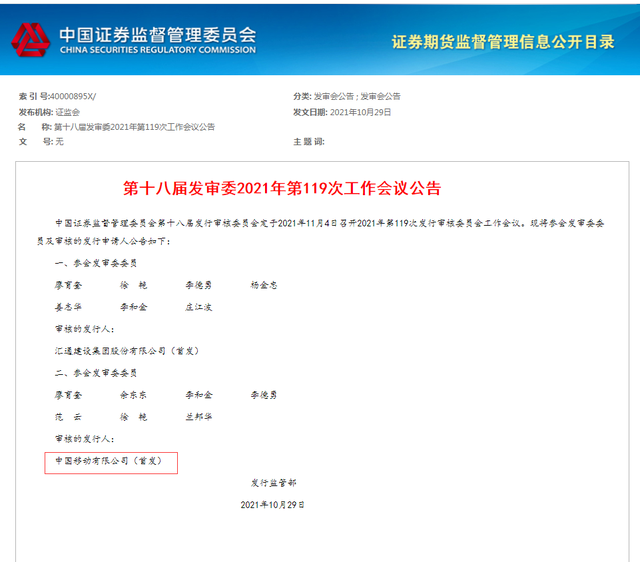 10月29日,证监会公告称,中国移动将于11月4日首发上会。