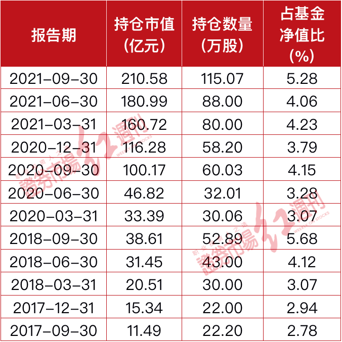 朱少醒管理的富国天惠成长就是一个典型的例子。一季度末,他持有茅台的数量为80万股,持仓市值为16.07亿元,而二季度末的持股数量已经增加到了88万股,持仓市值也增加至18.1亿元。随着三季度茅台股价的进一步下跌,他却对其进行了更大幅度的增持,三季度末,该基金持股茅台的数量达到了115.07万股,市值达到了21.06亿元,位列第一大重仓股。