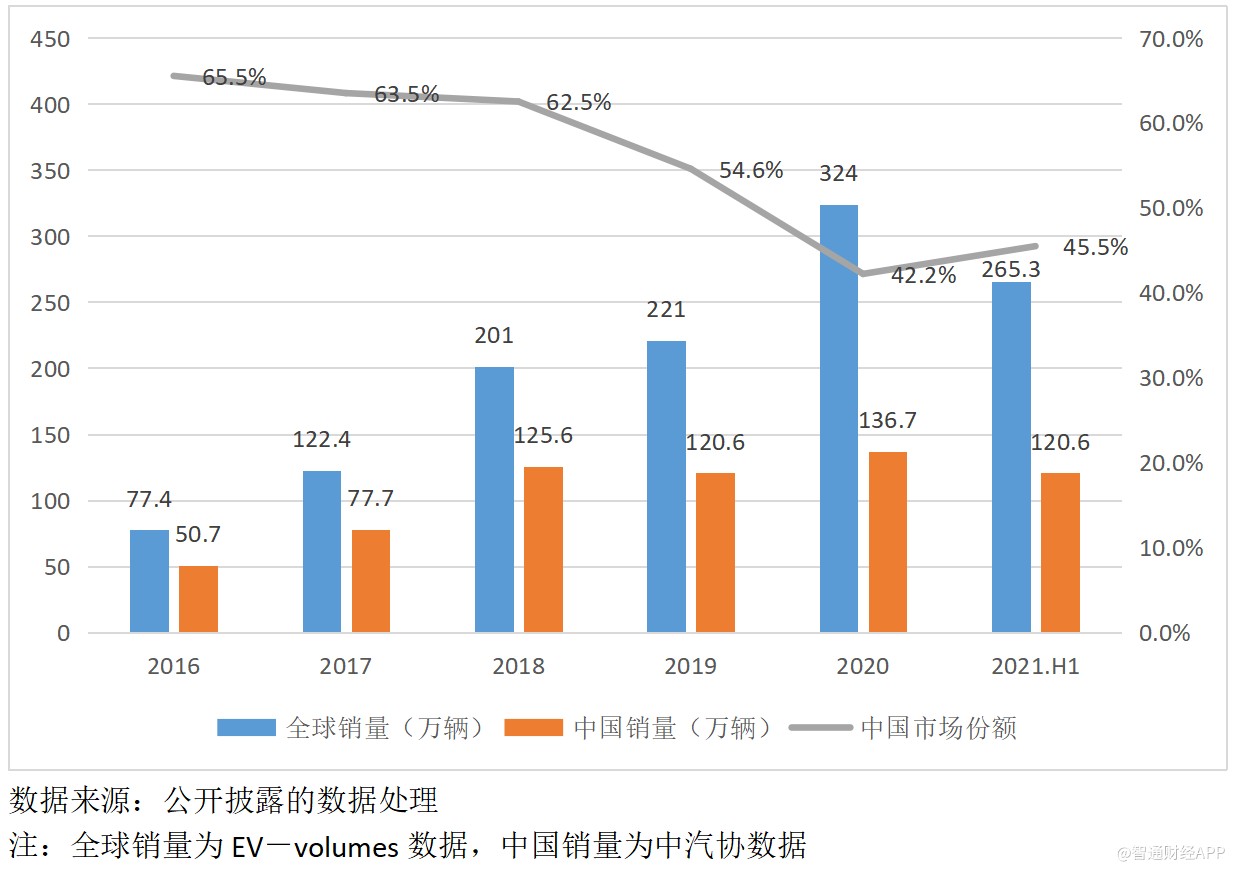 从行业来看,根据EV-volumes的数据,2020年,全球新能源汽车销量324万辆,近五年复合增长率43.04%,其中欧洲和中国市场份额占据超过80%。今年上半年,全球新能源汽车销量265.3万辆,同比增长168%,中国及欧洲市场销量均得到翻倍增长,市场份额分别为43.3%及40%。