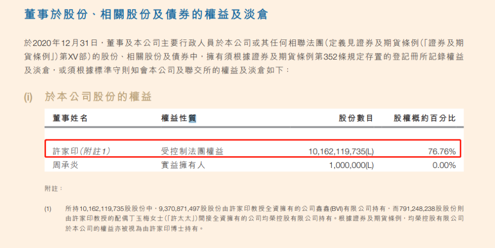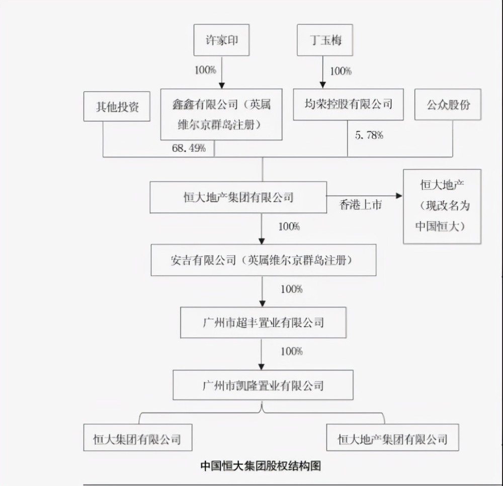 许家印和妻子分别注册了鑫鑫和均荣两家空壳持股公司,持有着在香港上市的76.7%的中国恒大股份。