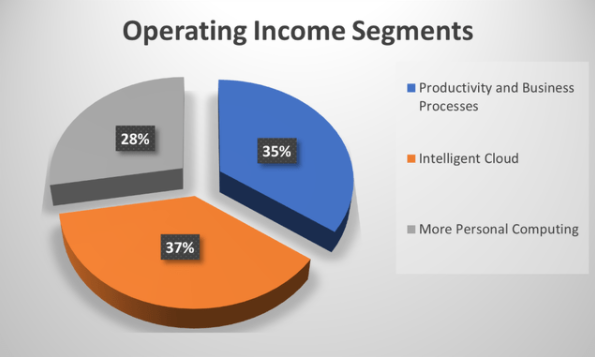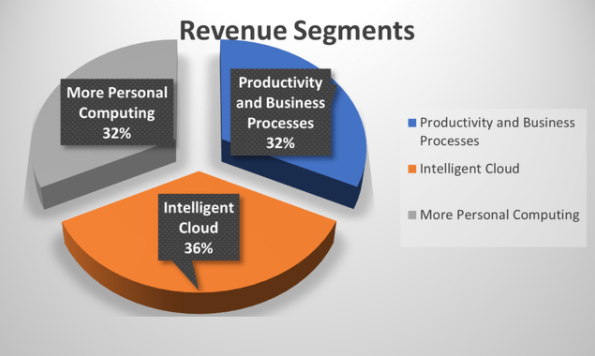 微软 $MSFT 的收入主要来自三个部分:生产力和业务流程、智能云和更多个人计算业务。下面的图表以百分比的形式显示了每个部分的权重。