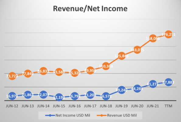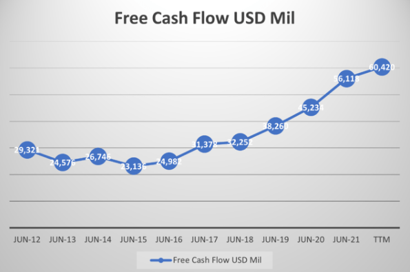 该公司一直在产生巨大的自由现金流,且数量还在上涨,这对将来微软 $MSFT 投资新技术研发会大有帮助,也是其保持竞争优势的关键点。