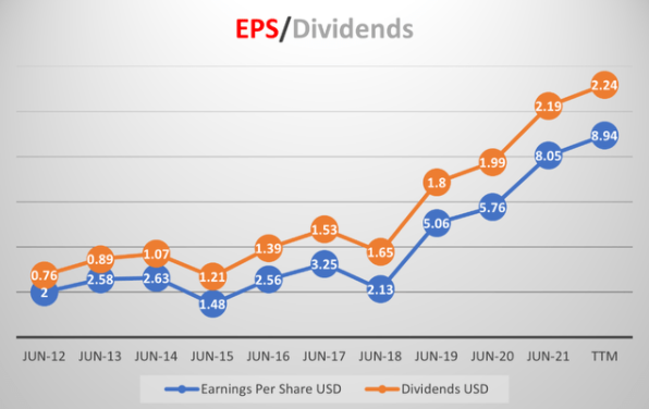 在过去的十年里,微软 $MSFT 的每股收益、股息也取得了大幅增长。