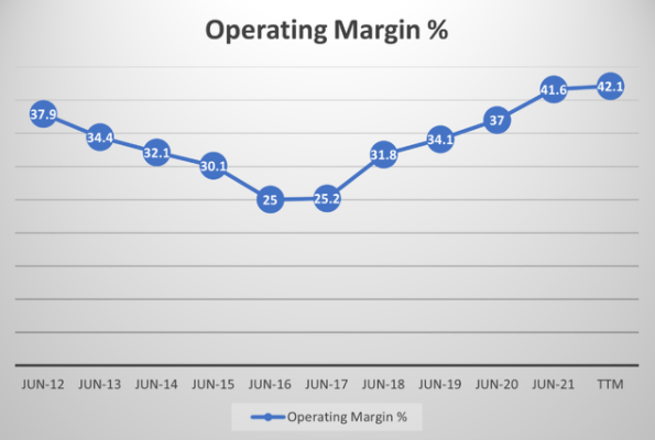 其营业利润率相当可观,目前约为40%,而且近些年一直稳步增长,2016-2017年的低谷主要是研发支出的增加导致。考虑到该企业大量的数据中心、周到的服务和产品支持、制造和分销中心、库存估值等都是成本的一部分,所以其长期保持在65%至70%之间的毛利率也是较高的。单从这些数据来看,作为一家成熟的科技巨头,微软 $MSFT 的护城河不可谓不宽厚。