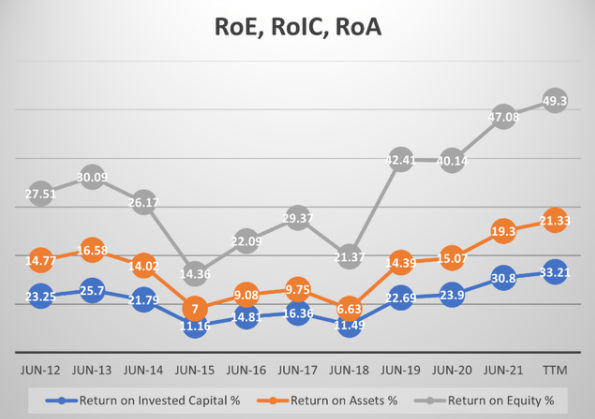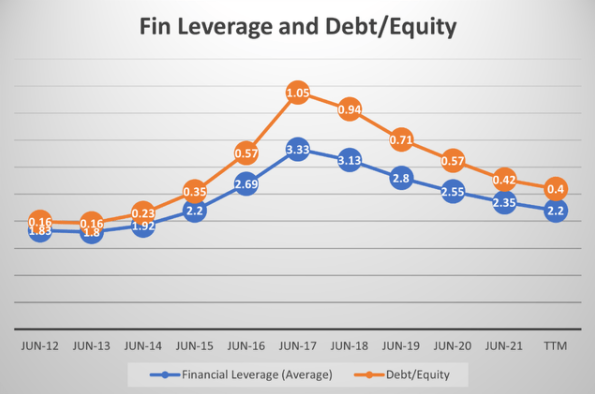 微软 $MSFT 的净资产收益率(ROE)、资本回报率(ROIC)和资产收益率(ROA)这三个指标都很亮眼,其中ROE已在近些年急剧上升到接近50%,而与此同时财务杠杆却在稳步降低。