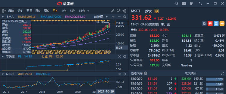 受财报利好消息刺激,微软的股价在刚刚过去的10月份最终录得17.63%的涨幅。