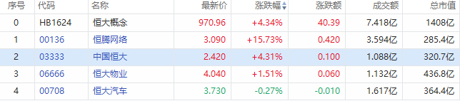 华盛资讯11月1日消息,恒大系股票午后持续拉升。截至发稿,恒腾网络涨15.73%,报3.09港元每股,成交额3.59亿港元;中国恒大涨4.31%,报2.42港元每股,成交额1.08亿港元;恒大物业涨1.51%;恒大汽车跌0.27%。