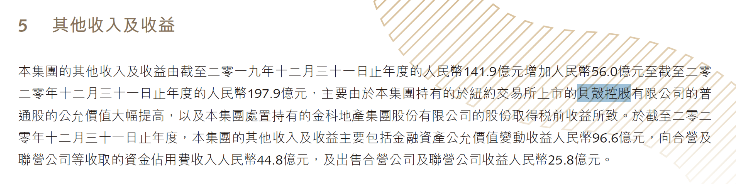 融创中国2020年业绩报显示,由于持有的贝壳股票浮盈,其金融资产公允价值收益净额由2019年的7.8亿元增至96.56亿元。由此也带动了融创中国其他收入及收益由2019年度的141.9亿元增加56亿元至2020年度的197.9亿元。