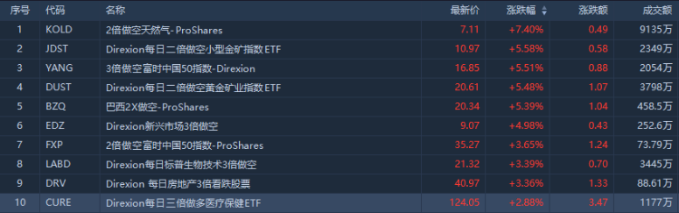 美股上个交易日涨幅前十的ETF
