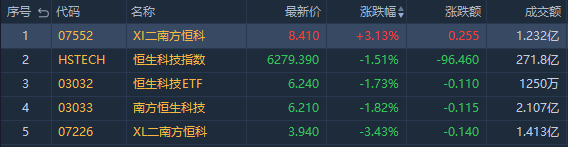 今日港股市场涨幅居前的主要为南方两倍做空恒科ETF $07552.HK ,收涨3.13%,成交额1.232亿港元。