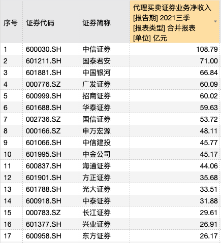 经纪业务方面,老牌券商银河证券进入前三位。据Wind,代理买卖证券业务净收入上,今年前三季度,中信证券以108.79亿元排在首位,国泰君安、中国银河紧随其后,广发证券、招商证券等该项业务收入也均超过50亿元。