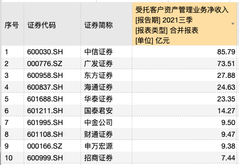 资管业务方面,上市券商表现分化。据Wind,受托客户资产管理业务净收入上,今年前三季度,中信证券、广发证券排在前两位,该项收入分别为85.79亿元、73.51亿元,远超其他家。