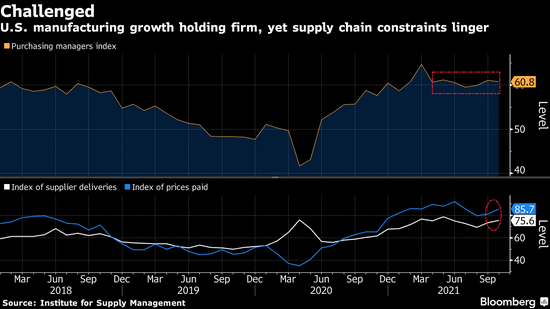 ISM的供应商交货指标升至五个月高位,表明生产商面临更长的原材料交货时间。劳动力短缺,间歇性停工和创纪录的商品进口使美国港口不堪重负,延误了交付时间。