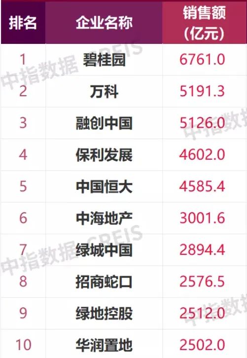 10月31日晚间,中指研究院、克而瑞、亿翰智库等多家研究机构纷纷发布今年1~10月房企销售业绩榜单。中指研究院数据显示,今年前10月碧桂园以6761亿元的销售业绩继续稳居首位,万科、融创和保利分列二、三、四名。排名前四的房企总计销售额达21680亿元。
