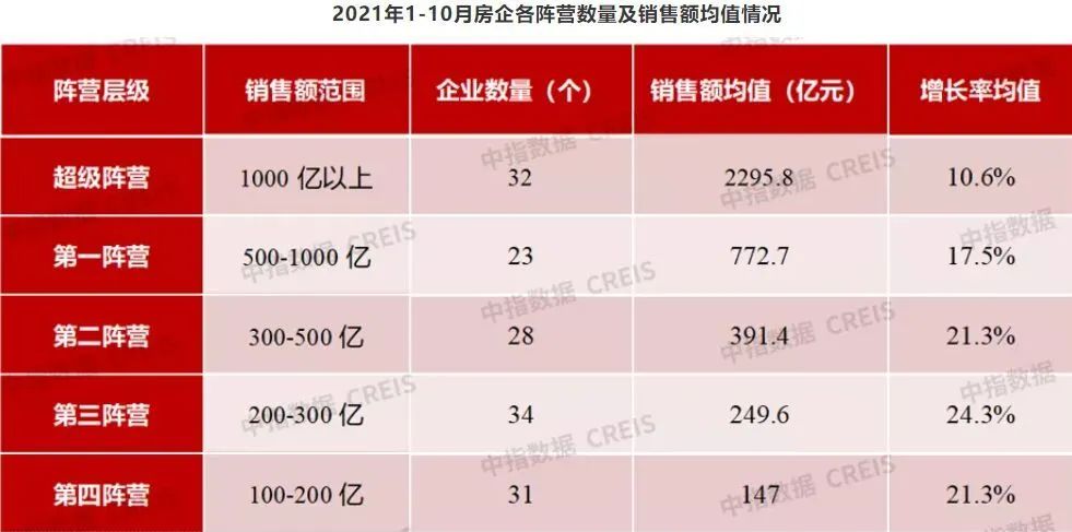 中指研究院数据显示,前10月不同阵营房企的业绩进一步分化。32家千亿“超级阵营”销售额增长率均值为10.6%,第一阵营(500亿-1000亿元)23家房企销售额增长率均值为17.5%。第二阵营(300亿-500亿元)28家房企销售额增长率均值为21.3%;第三阵营(200亿-300亿元)34家房企和第四阵营(100亿-200亿元)31家,销售额增长率均值分别为24.3%和21.3%。