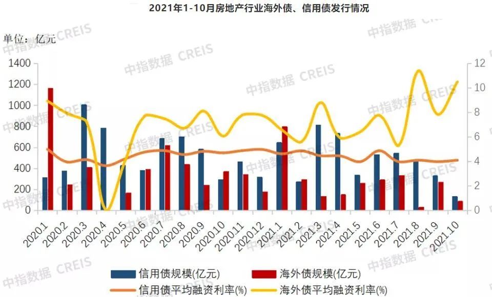 据中指研究院统计,10月份房地产信用债发行规模陡降,为130.01亿元,仅为9月份327.9亿元的1/3规模;10月内地房企海外债发行规模为84.27亿元,同样下降明显。从融资成本来看,信用债与海外债融资成本都有所上升,其中信用债平均利率为4.08%,环比上升0.12个百分点;海外债平均利率为10.49%,环比上升2.66个百分点。