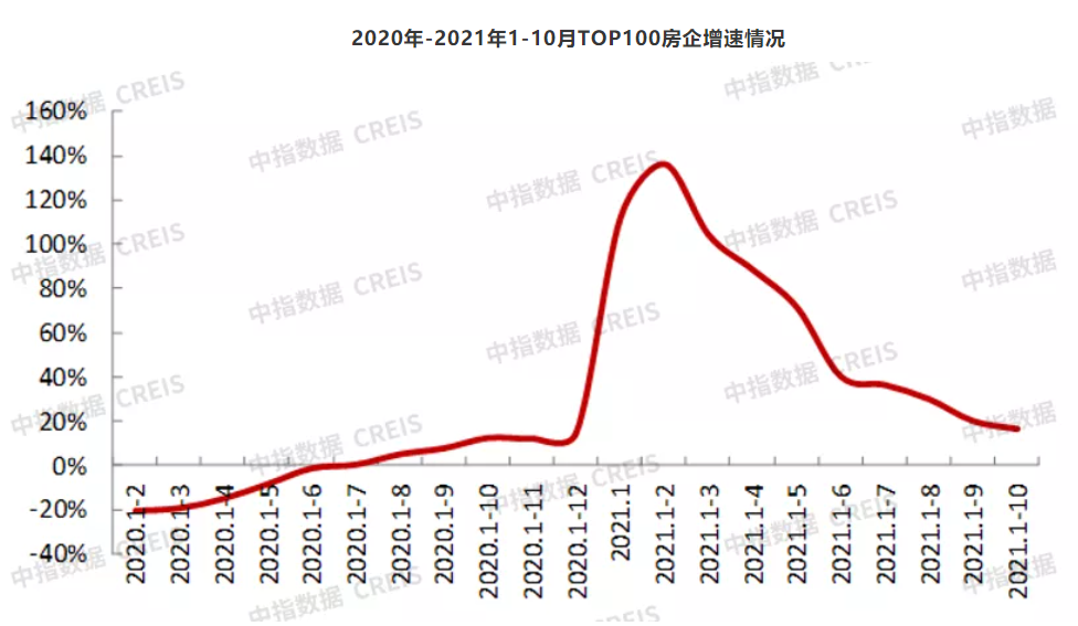 中指数据显示,2021年1~10月百强房企销售额均值为1067.5亿元,同比增长16.3%,与1~9月平均增长率19.9%、1~8月增长率均值为29.8%相比,继续呈现下滑趋势。并且从趋势图上看,百强房企增速在1~2月达到全年峰值之后即出现了大幅下降,呈现“倒V字”走势。