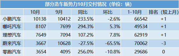 原标题:造车新势力10月销量出炉:哪吒排名跃升第二 蔚来遭遇“脚踝斩”
