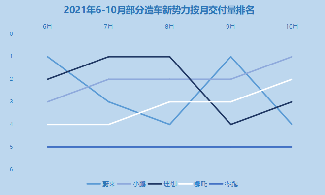 不同的是,5家造车新势力10月的交付情况发生了更为戏剧性的变化——10月,仅有哪吒汽车实现了环比增长,并攀升至排行榜第二位;而小鹏汽车、理想汽车、蔚来汽车和零跑汽车均出现了环比下降。上月排名第一位且销量破万的蔚来汽车,则出现了较大幅度的下跌,仅交付了3667辆,排名也骤降三位。