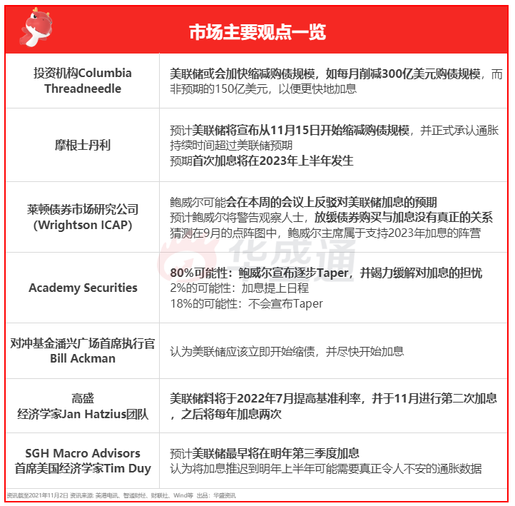 针对此次美联储议息会议,多家机构认为鲍威尔宣布逐步Taper的可能性较大,但认为美联储不会在本周会议上宣布加息: