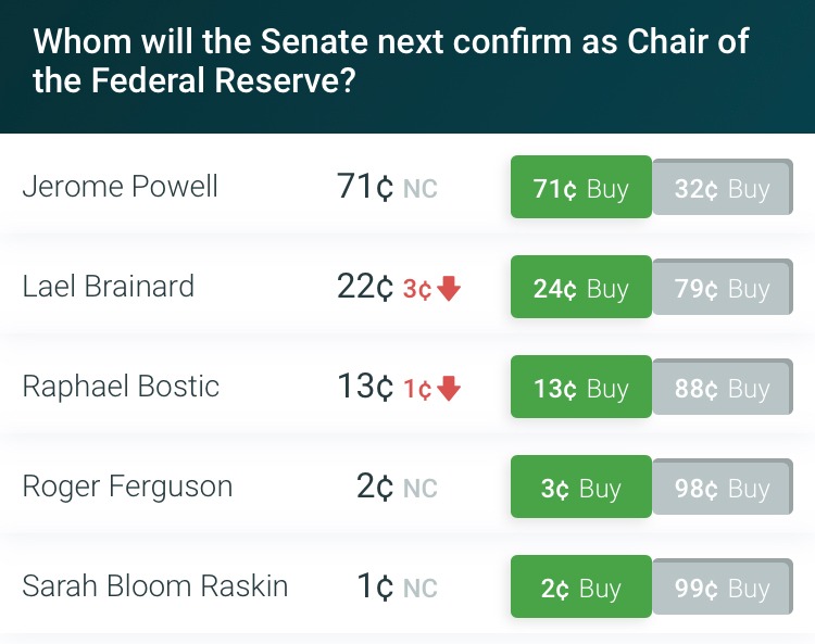 Predict It网站数据显示,当前鲍威尔连任的概率为70%。