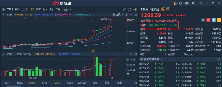 华盛资讯11月2日讯,美股盘前,特斯拉(TSLA)盘前回调2.33%,昨日收涨近8.5%。