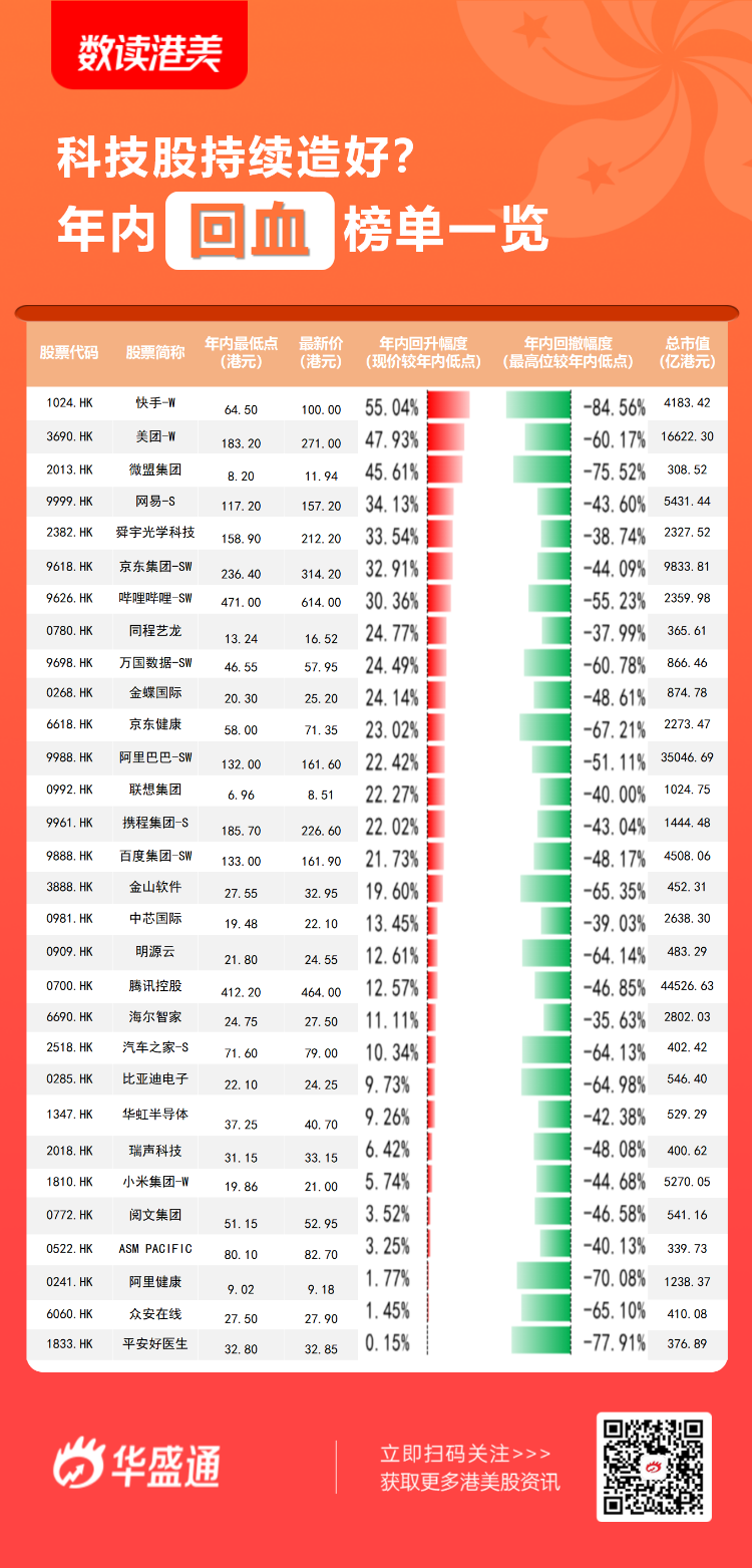 近期,港股科技股逐渐走出阴霾,其中快手-W反弹最为明显,回血幅度超过50%位于榜首,此前快手宣布换帅,联合创始人宿华卸任CEO一职。美团、微盟集团自年内最低点已累计回升超40%,舜宇光学科技、网易-S回升超30%,京东集团-SW、哔哩哔哩-SW、阿里巴巴等也反弹逾20%。