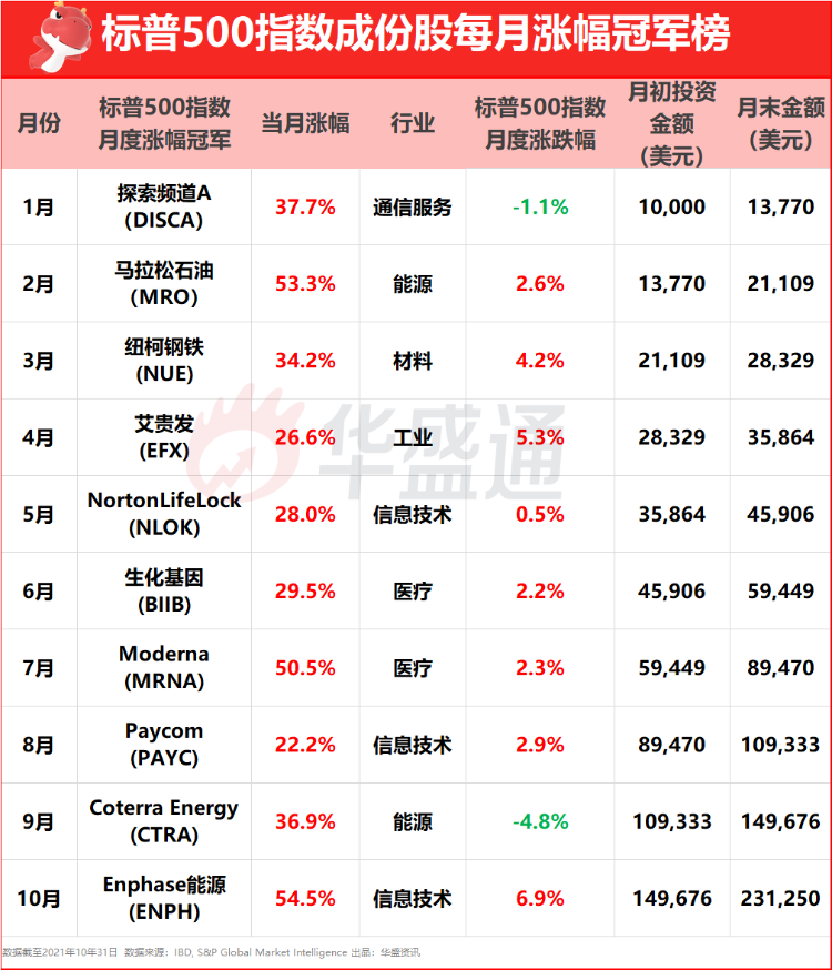 简单点说,就是用这1万美元每个月投资以下这些标普500指数每个月涨幅最大的股票。