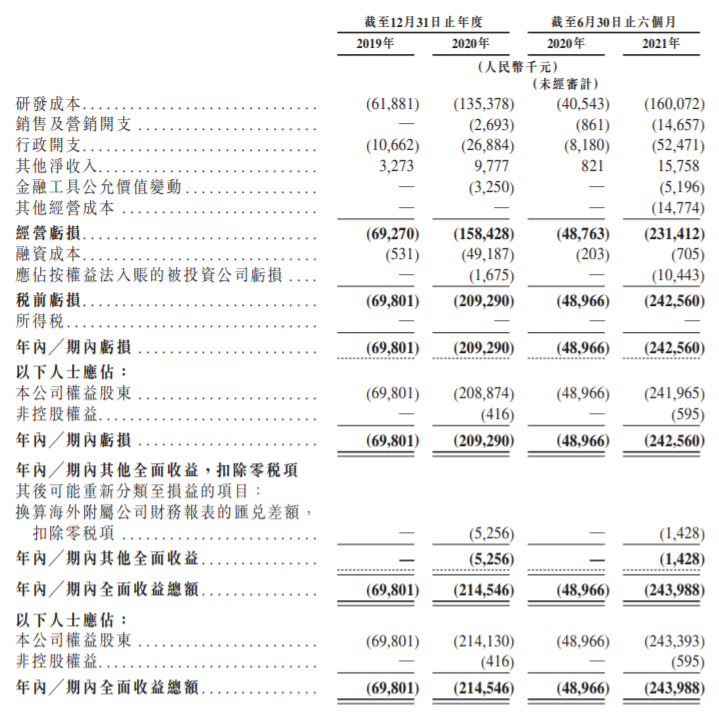 2019年至2021年上半年,微创医疗机器人仍未盈利,公司分别录得亏损净额人民币6980.1万元、2.09亿元及2.43亿元,主要由于公司的研发成本及行政开支所致。同期的研发生产成本分别达到6188.1万元、1.35亿元以及1.60亿元。